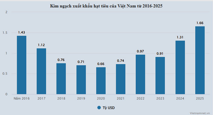 Như vậy, xuất khẩu hạt tiêu năm 2025 chính thức vượt qua con số gần 1,43 tỷ USD của năm 2016 để thiết lập kỷ lục lịch sử mới.
